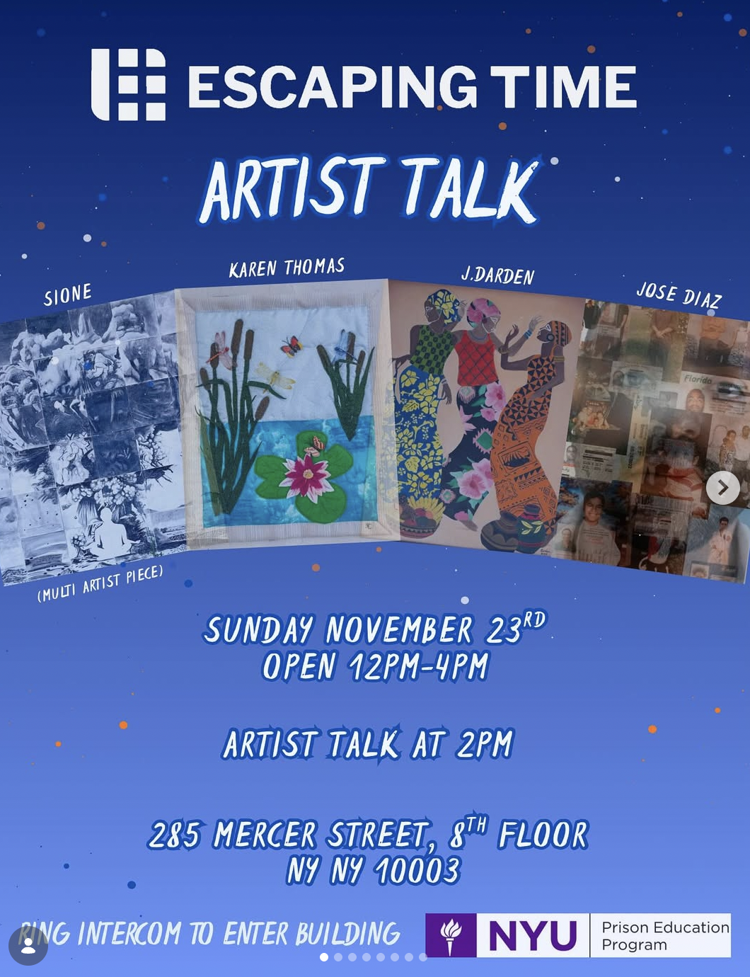 Join us Sunday November 23rd at NYU as Escaping Time hosts an artist talk featuring Jose Diaz, Karen Thomas, and Sione. They’ll be discussing decentering the institution and centering art as a means of growth and expression in jails and prisons.