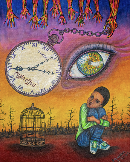 Being an artist while incarcerated has helped with the burden of financial stability and independence. It has opened doors of job opportunities within the prison system and in the outside world. Painting provides an escape from emotions surrounding my captivity into the work at hand. Life can be conflicting, but painting, creating, helps make sense of it all.”